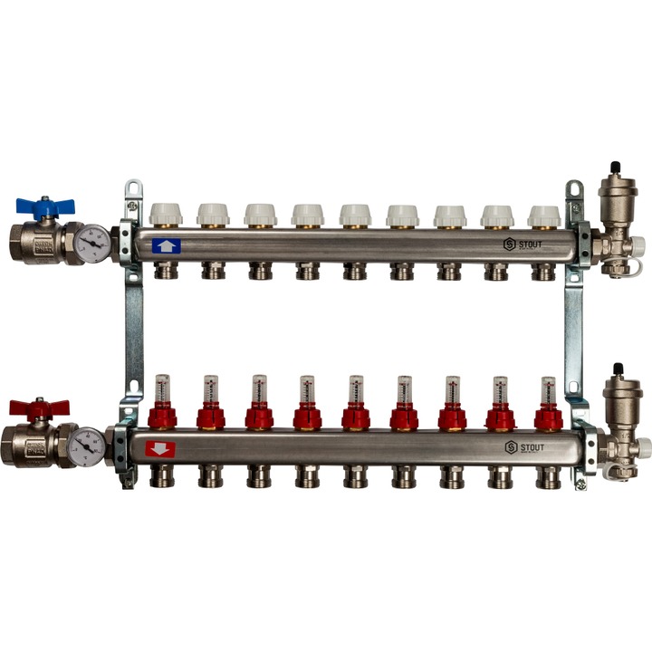 Коллектор нержавеющий с расходомерами, укомплектованный с 1 дюймовым и 3/4 дюймовым подключением и 9 выходами от компании STOUT - это компонент системы, который используется для распределения жидкости или газа из одного источника в несколько потребителей.