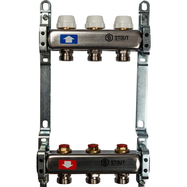 Коллектор из нержавеющей стали с запорными клапанами 3 выхода от компании STOUT - это компонент системы, который предназначен для распределения жидкости или газа из одного источника в три потребителя с возможностью регулировки потока.