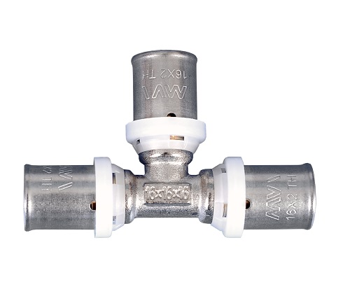 Пресс-фитинг тройник MVI предназначен для соединения трех металлопластиковых труб между собой. Корпус фитинга выполнен из латуни марки CW617N, уплотнительные кольца – из EPDM, пресс-гильзы – из нержавеющей стали. Для монтажа применяется пресс-инструмент с насадками типа «ТН»