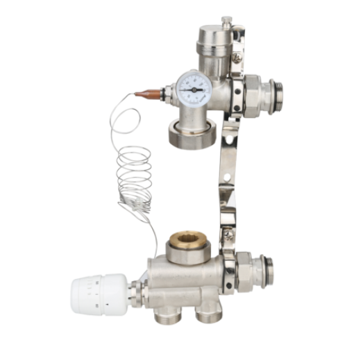 Насосно-смесительный узел обжимной Valtex Valmix применяется в системах отопления «теплый пол». Служит для поддержания заданного температурного режима теплоносителя во вторичном циркуляционном контуре, а также для контроля его расхода. С пластиковыми или металлопластиковыми трубами соединяется методом обжима. Длина устройства составляет 130 см, корпус и насадки изготовлены из устойчивой к коррозии латуни. Узел снабжен необходимыми контрольно-измерительными приборами. Поставляется без циркуляционного насоса.